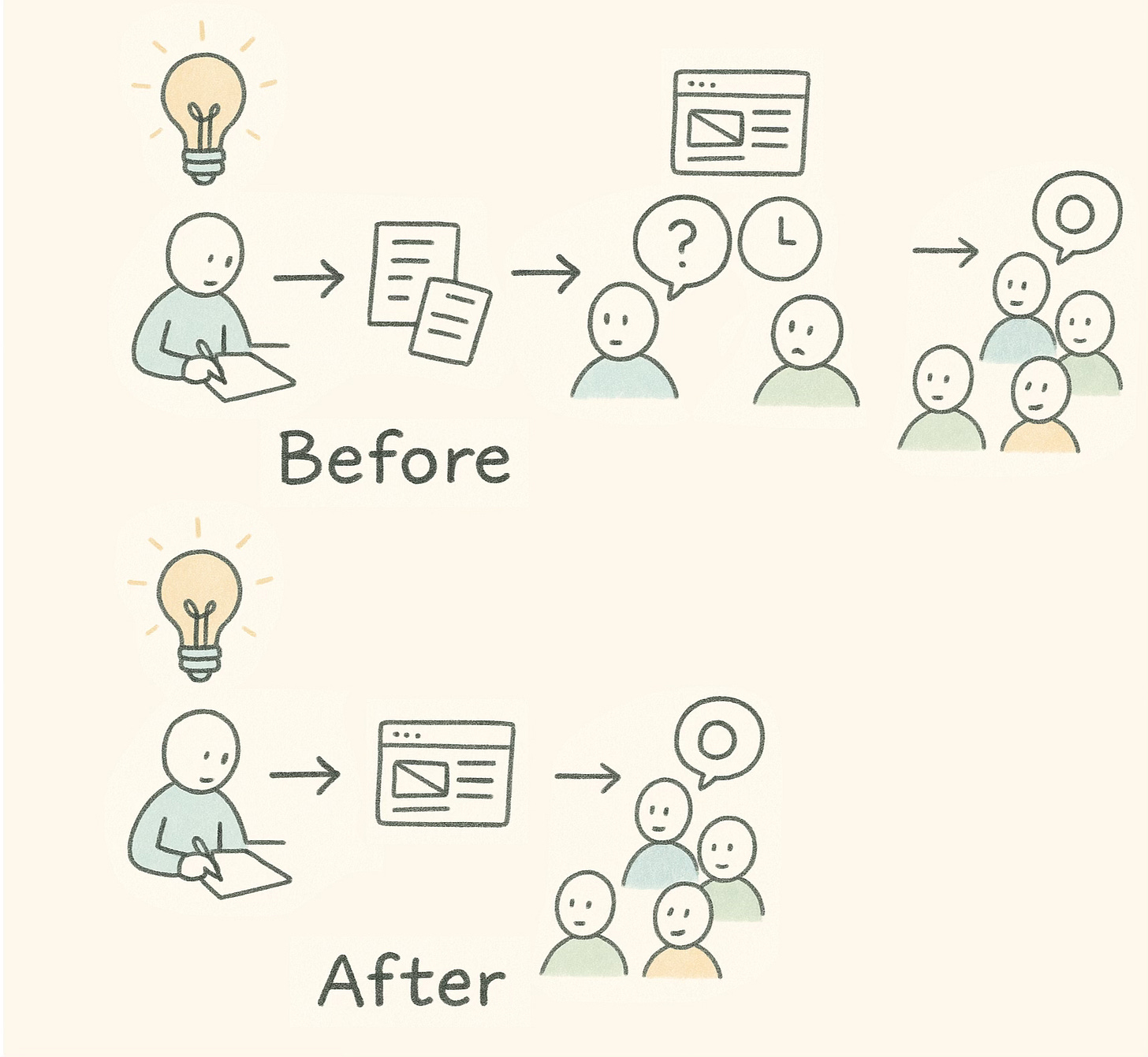 Before, my workflow looked like this: Have a hypothesis. Document it carefully. Write requirements. Hand it to a designer. Wait. Hand it to a developer. Wait some more. Get something back two weeks later if I was lucky. Test it. Learn something. Repeat.
